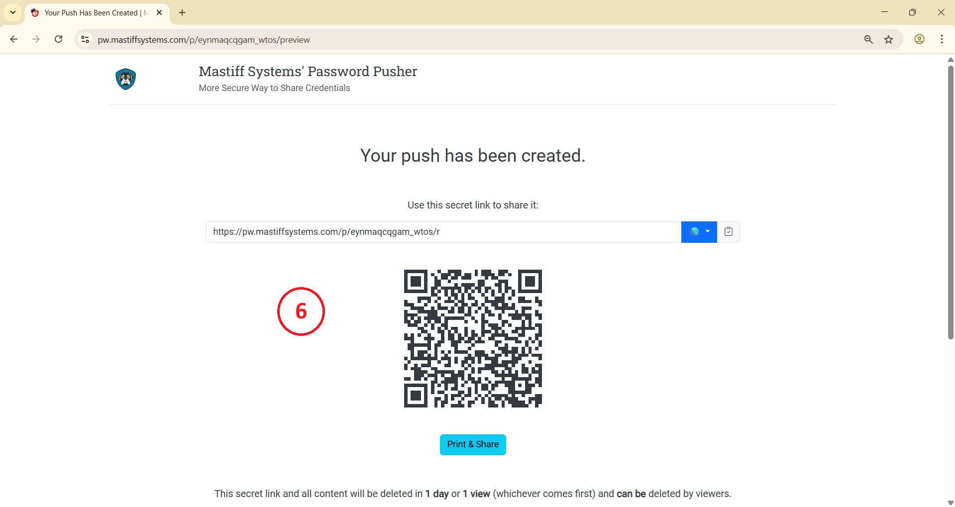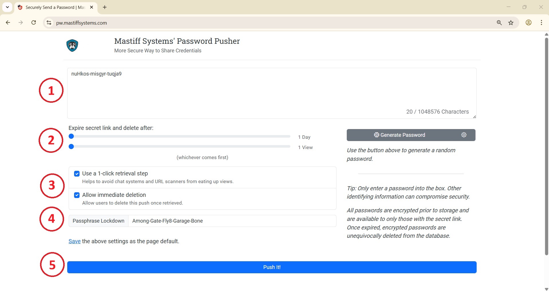 - For each password, create a new Password Pusher entry using the same security settings: - Expire after 1 day - Limit to 1 view - Enable: ✅ 1-click retrieval step and ✅ Allow immediate deletion - Add a unique passphrase for each link